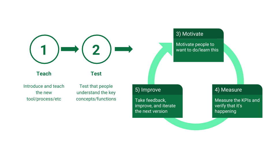 - Launch the new initiative/tool but you need to make sure that people are A) using it and B) succeeding